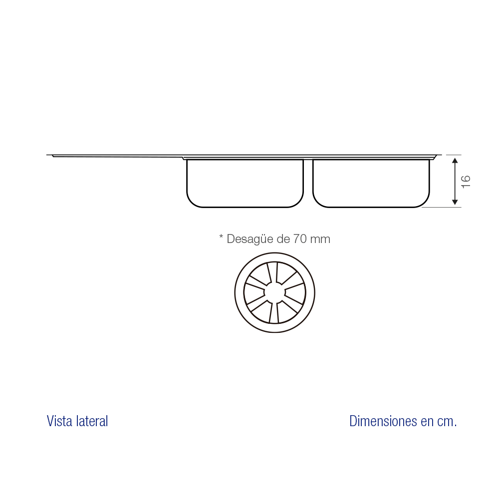 • 2 desagües de 70 mm con tapón